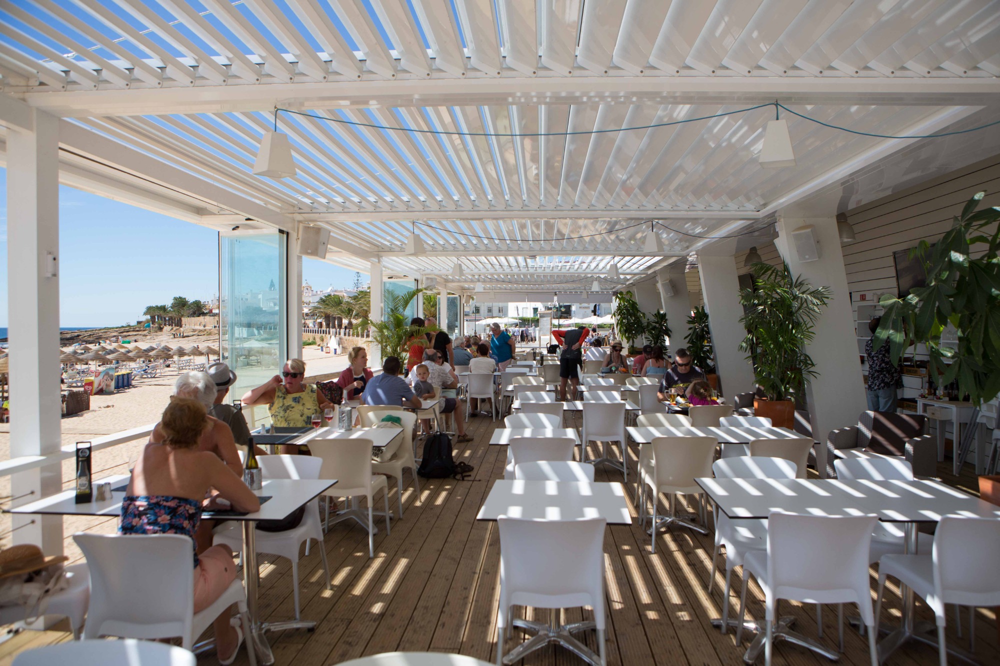 Pérgola de aluminio con techo de paneles en movimiento. Función manual o motorizada.