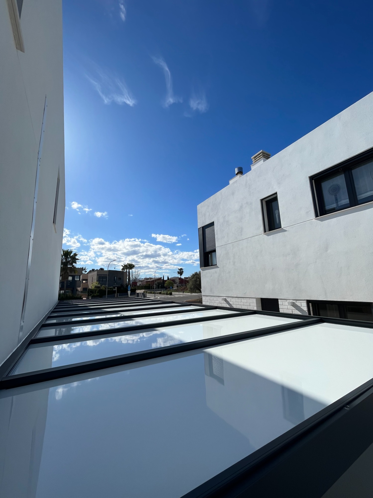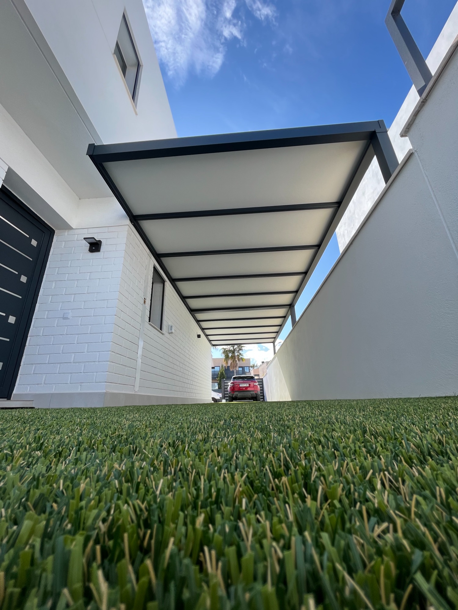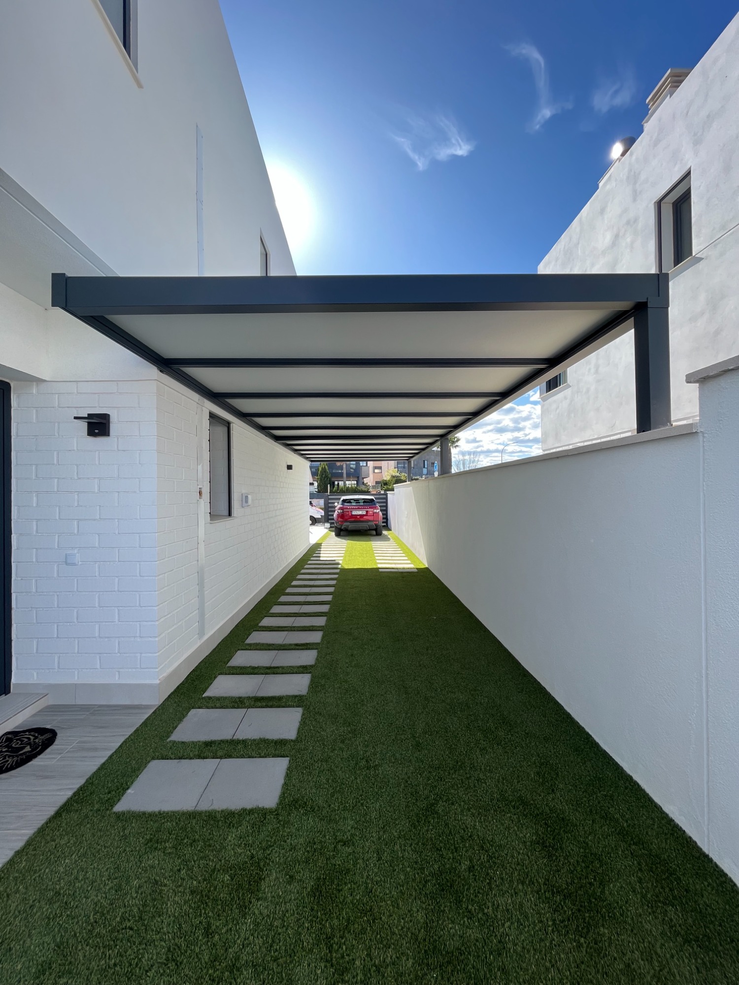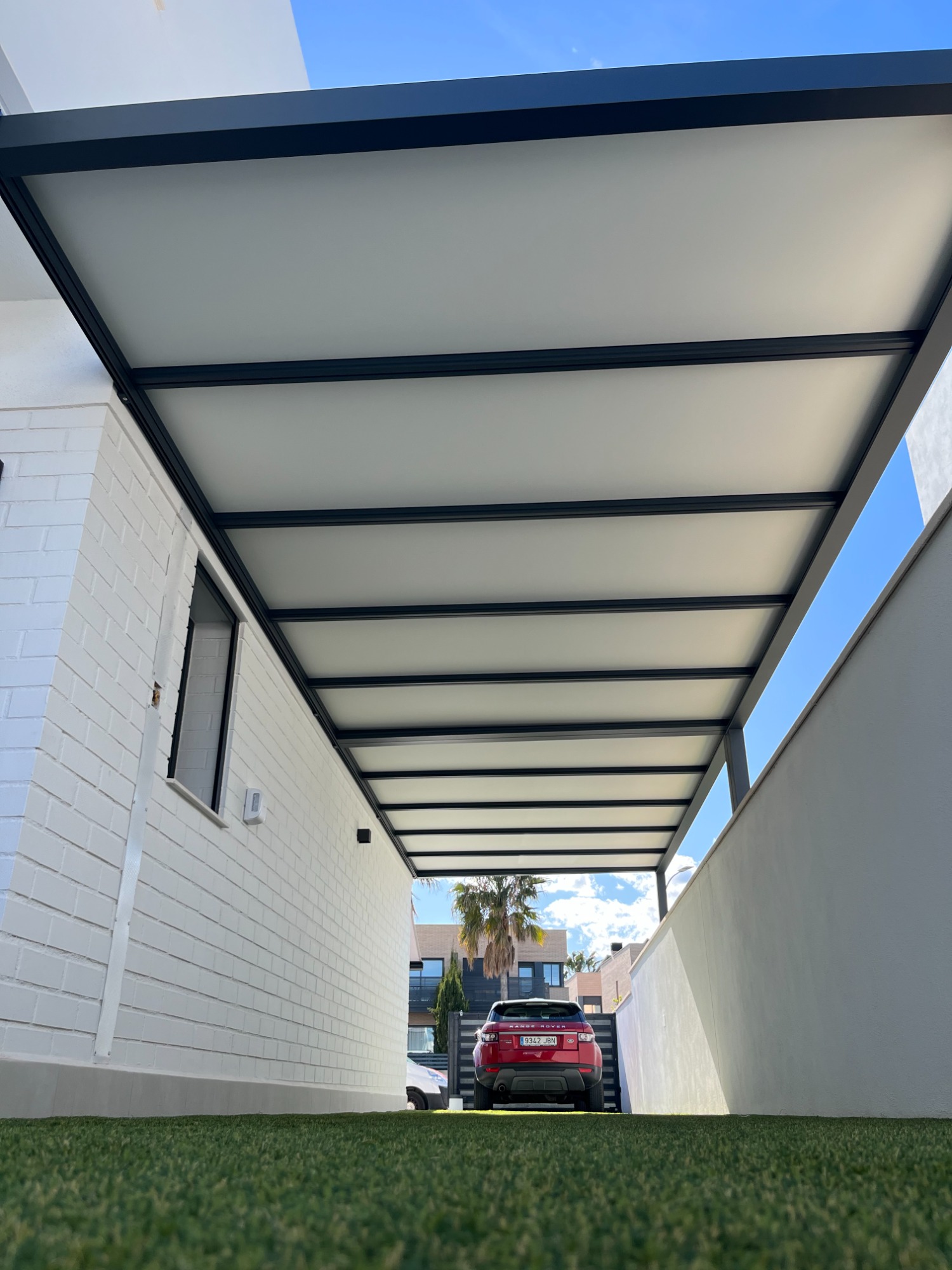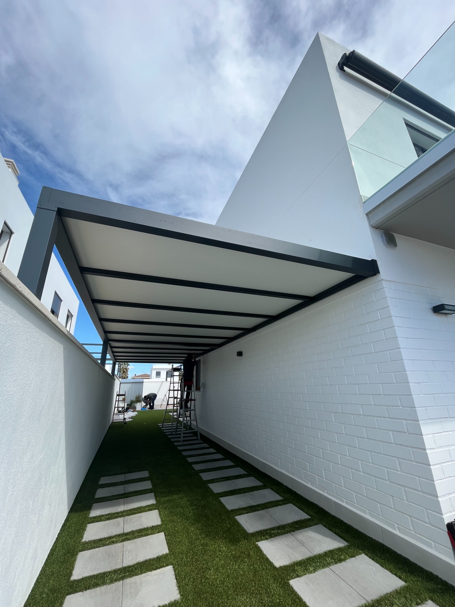 Pérgola de aluminio con techo de paneles sandwich, ideal para terrazas.