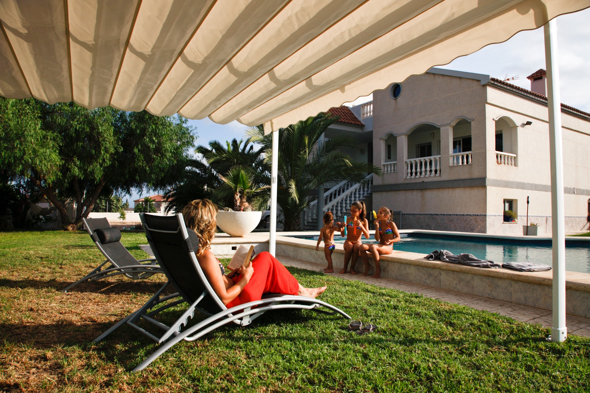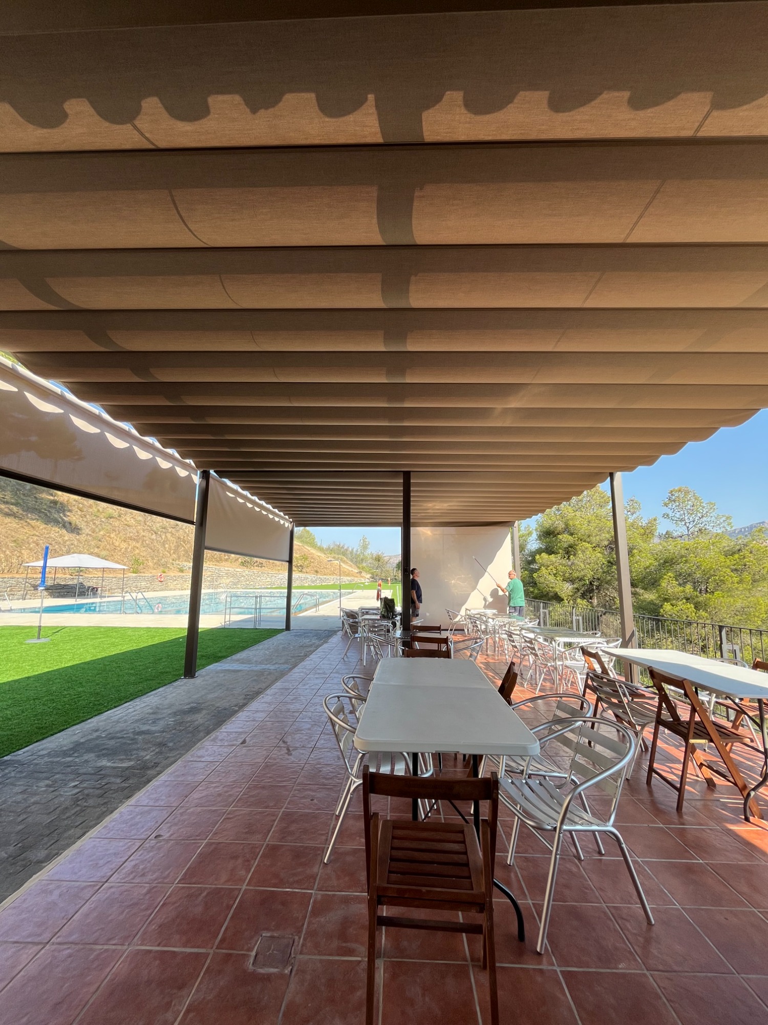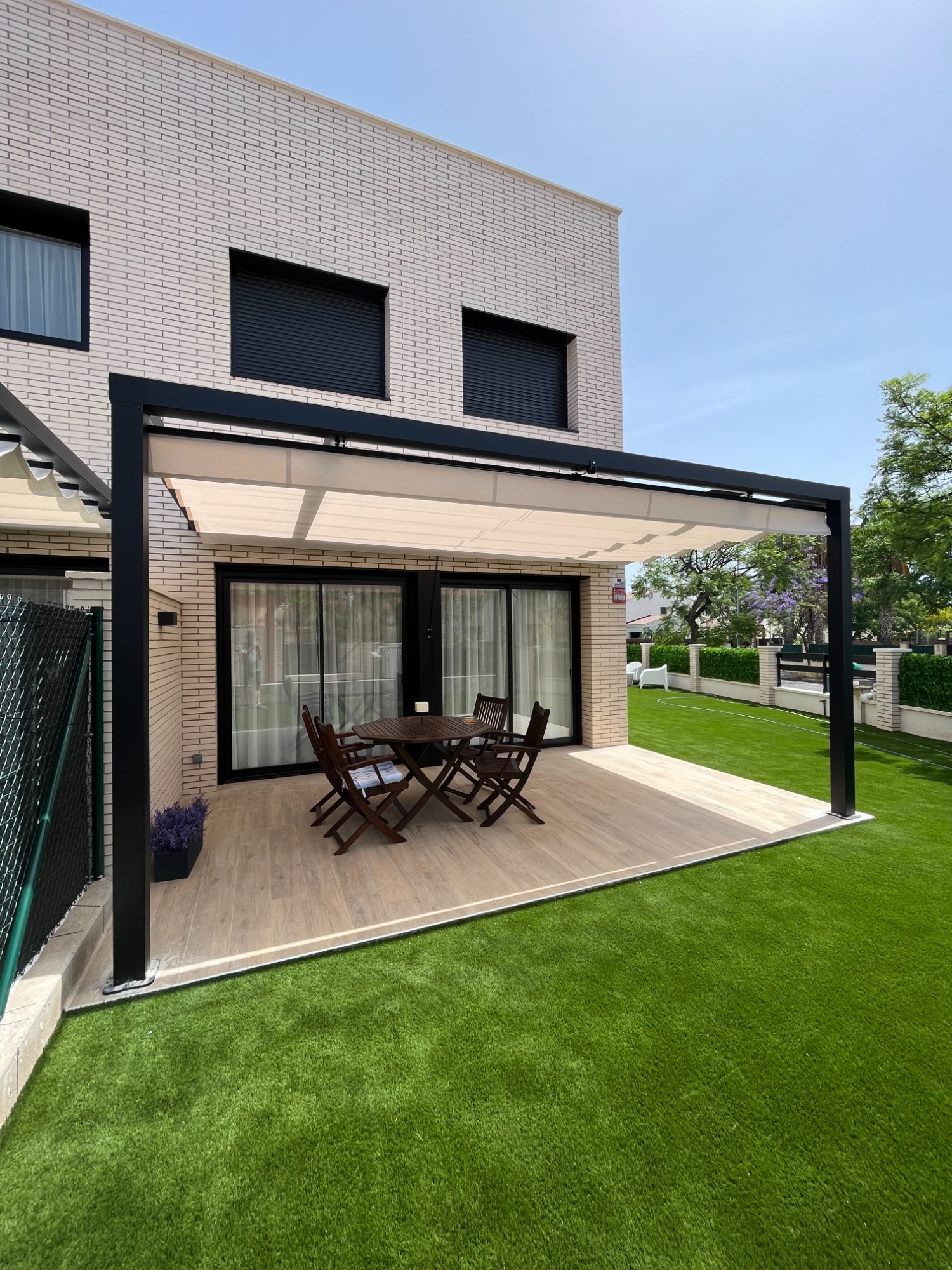 Toldo plegable guiado en estructura de aluminio o madera, recogida con cuerda o motor.